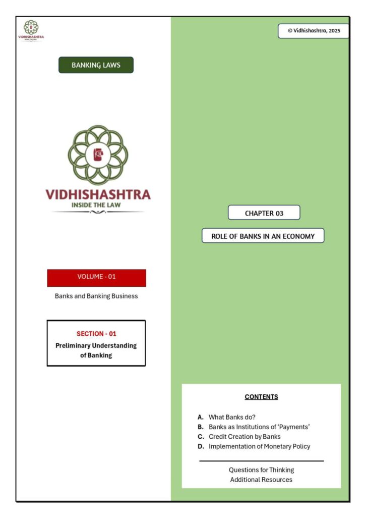 Reading material developed at VIDHISHASHTRA is a comprehensive coverage of core concepts related to various aspects of a domain. The present sample is a component of Section 01 of Volume 01 of Banking Laws entitled as “Role of Banks in an Economy” which attempts to demonstrate the functions of banks as institutions of payments, sources of credit creation and as nodal points for the implementation of monetary policy as defined by the MPC of RBI.